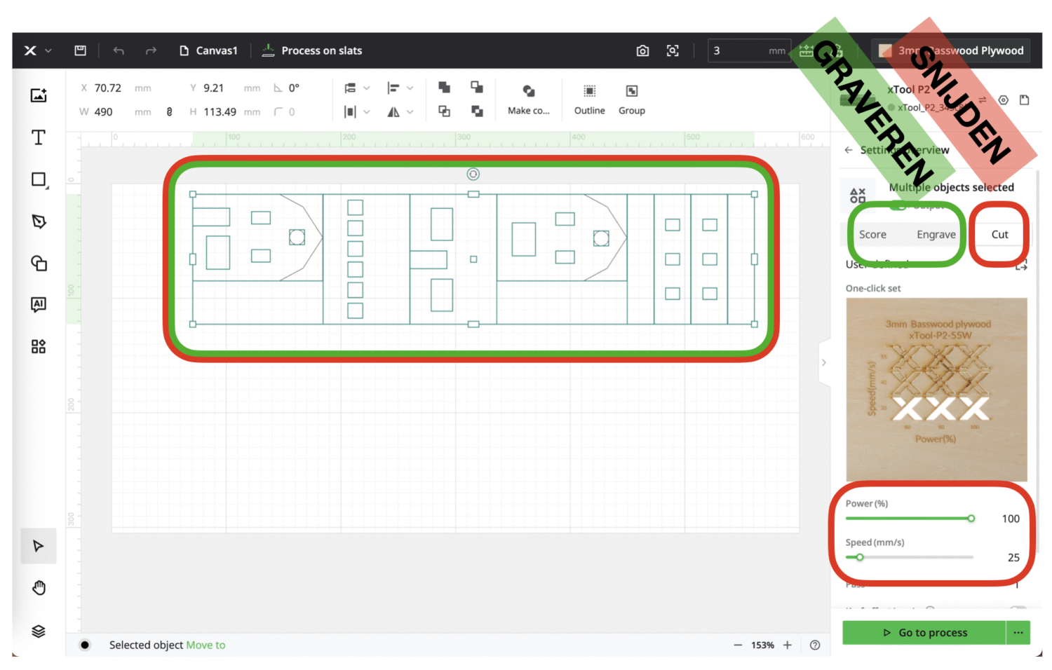 π Als er kleine details bij zitten die niet uitgesneden moeten worden maar getekend, klik deze dan aan en kies rechts in het menu voor Score (tekenen). De instellingen (power en speed) staan gelijk goed!