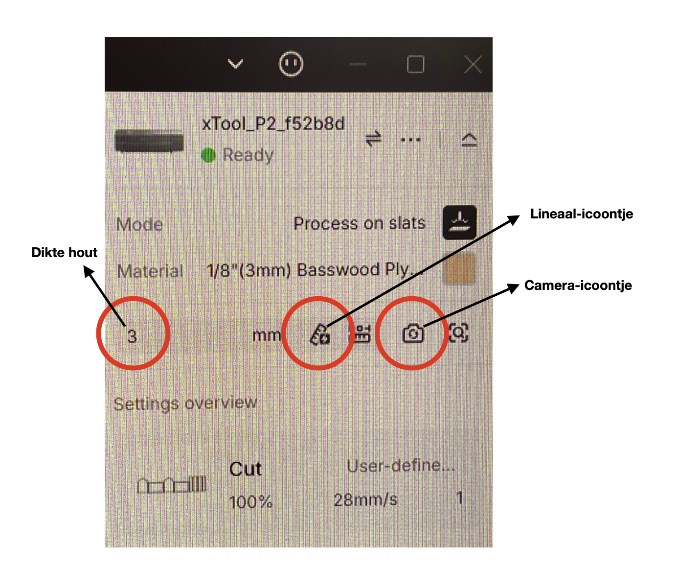 In het scherm van Xtool zie je aan de rechterkant een camera-icoontje π·.