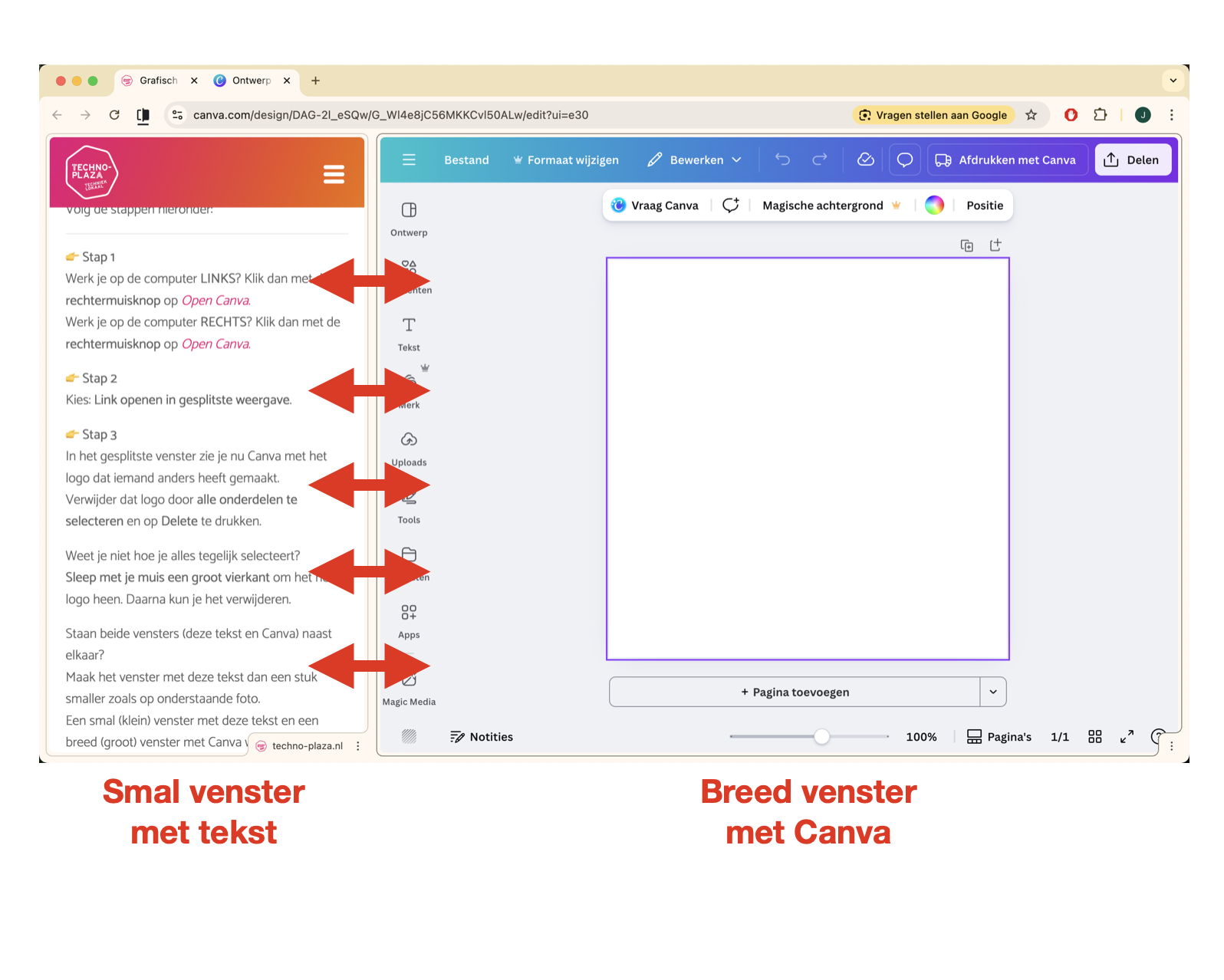 Straks ga je de website van Canva openen in een gesplitst tabblad, zodat je zowel de instructie als je ontwerp tegelijk kunt zien.